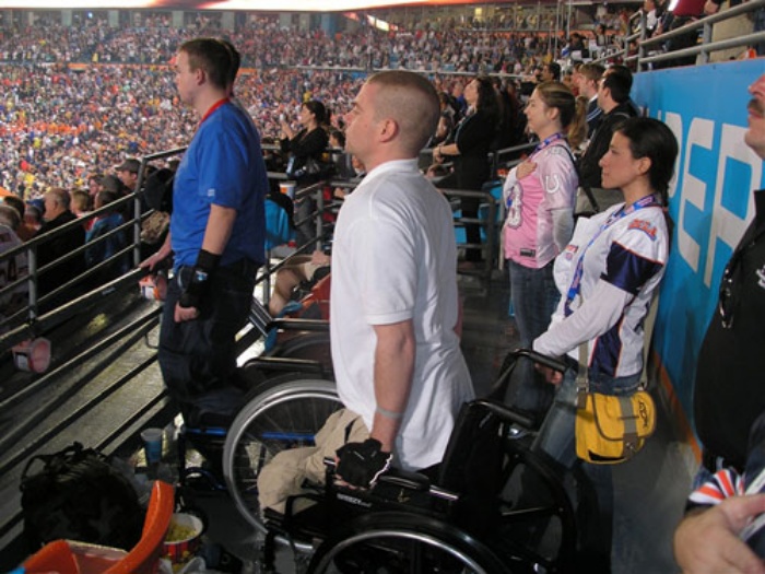 He may no longer be able to walk, but when the national anthem begins, James — a former Marine — finds the strength to rise in spirit. His legs may have given out, yet his heart stands stronger than ever.