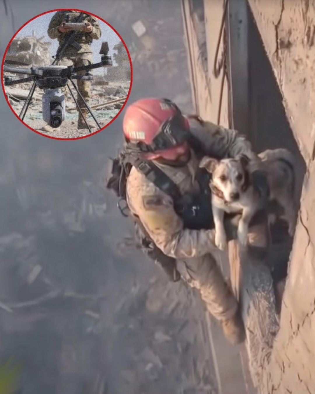 Amid the ruins of a partially collapsed building, a rescue team used drones to scan for any remaining signs of life. The footage revealed a heartbreaking sight — a lone dog, trembling on the edge of a shattered structure, surrounded by debris and dust. The building looked moments away from completely giving way.