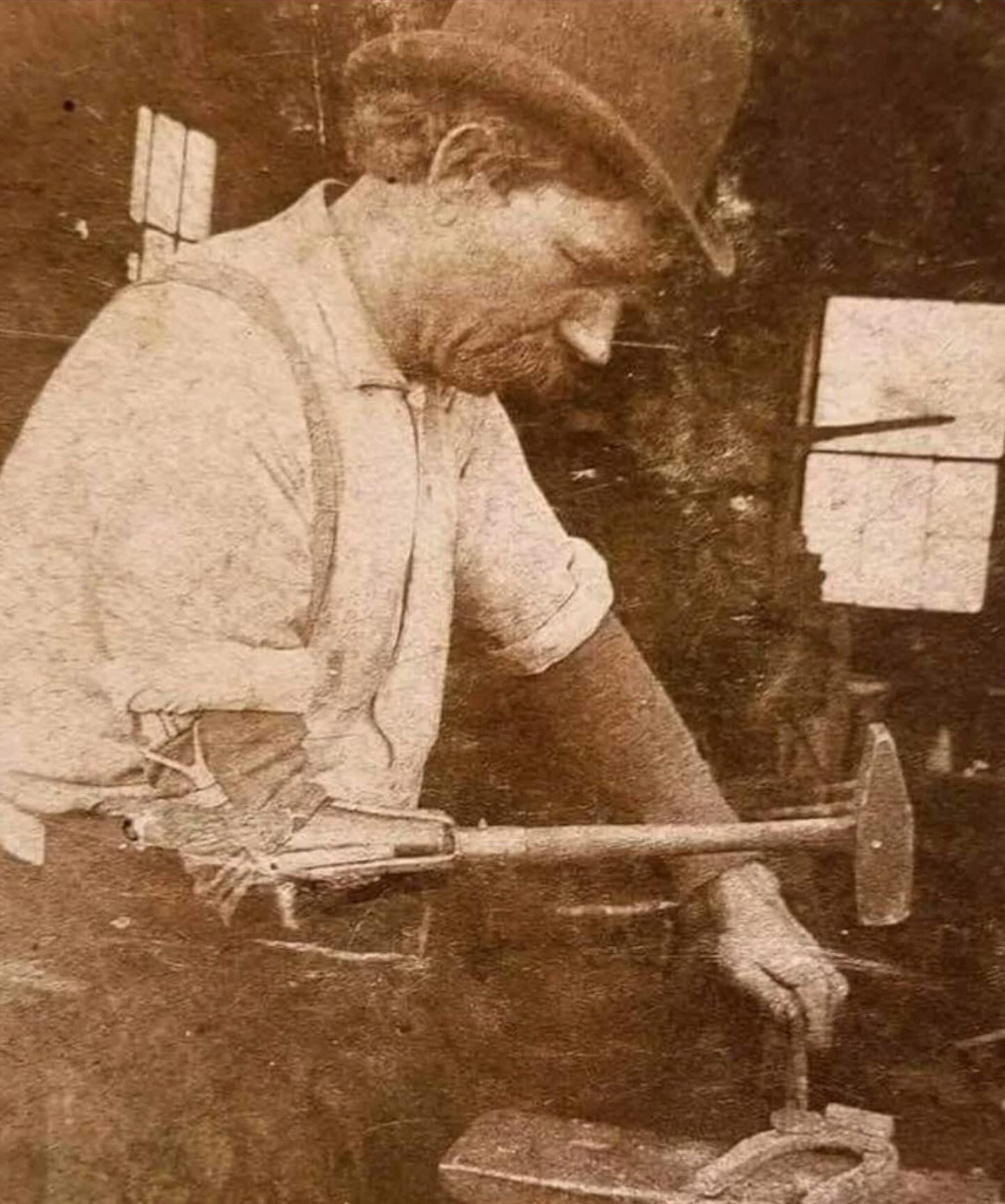 The man captured in this striking photograph was no ordinary blacksmith. After losing part of his arm, he faced a decision that would define the rest of his life: leave behind the craft he loved, or find a way to continue. His solution was nothing short of remarkable. Instead of stepping away from his trade, he forged his own path—literally—by attaching a hammer directly to his stump.