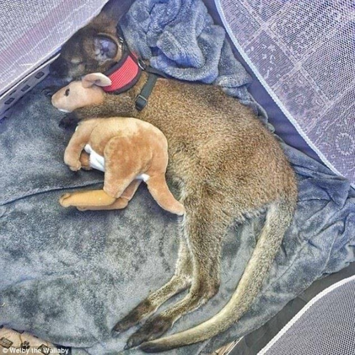 In the quiet corners of a wildlife rescue center, a baby wallaby sleeps with a stuffed toy clutched tightly in his tiny arms. To anyone passing by, it might look sweet, even playful. But the truth behind this image is far more moving. The toy has become his source of comfort after the sudden loss of his mother.