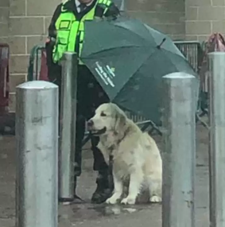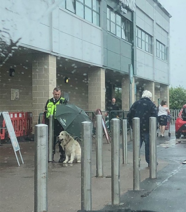 “It hadn’t been raining when we went in, but as we came out we noticed how heavy and suddenly the rain had started,” Gracie told. “The security guard who’s usually at the front doors was standing with the dog keeping him dry and I just thought it was lovely!”
