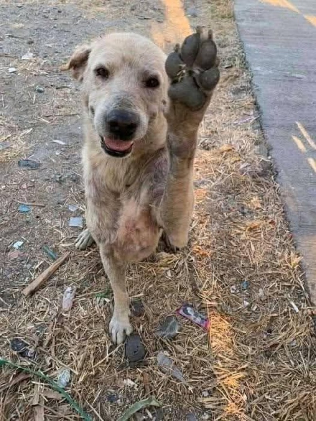 While walking down a quiet street, one passerby noticed a small figure sitting by the sidewalk. The dog looked worn out, his fur matted and his body showing the marks of a hard life. Yet, in that moment of chance encounter, something remarkable happened—he lifted his paw in greeting, as if asking gently, “Please, notice me.”