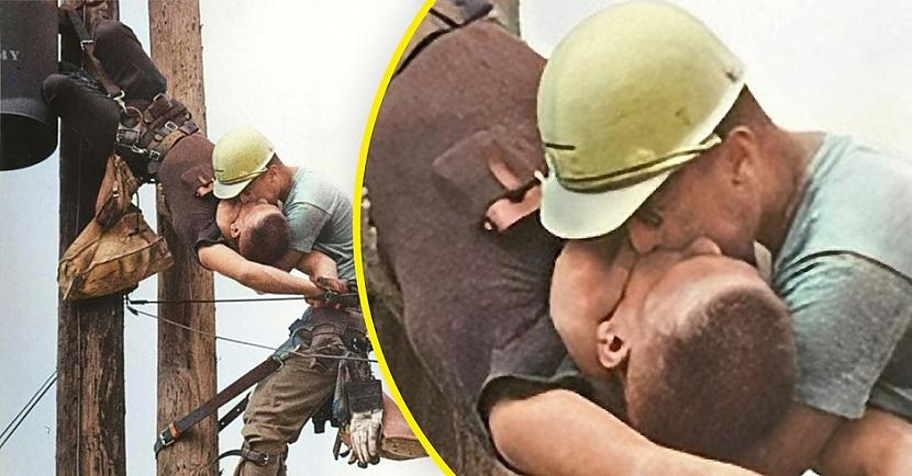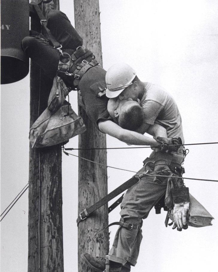 Journalist Roko Morabito, who worked for the Jacksonville Journal, was returning from covering a railroad strike when he saw a worker hanging from a pole. He used the car radio to tell the newspaper to call an ambulance, and after taking the photo, he called again on the radio, saying, “Maybe you’ll want to wait. I think I have a pretty good picture. โ
