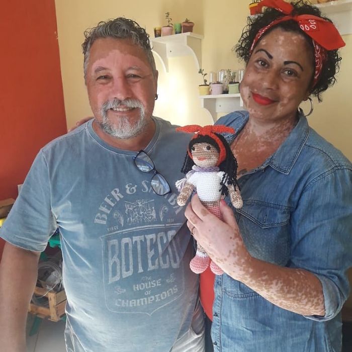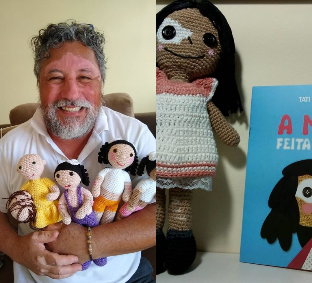 João recently made a doll for author Tati Santos de Oliveira, whose daughter Maria Luiza was three years old when white spots began to gradually appear on her little legs, back and arms.