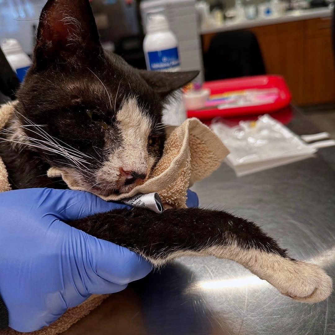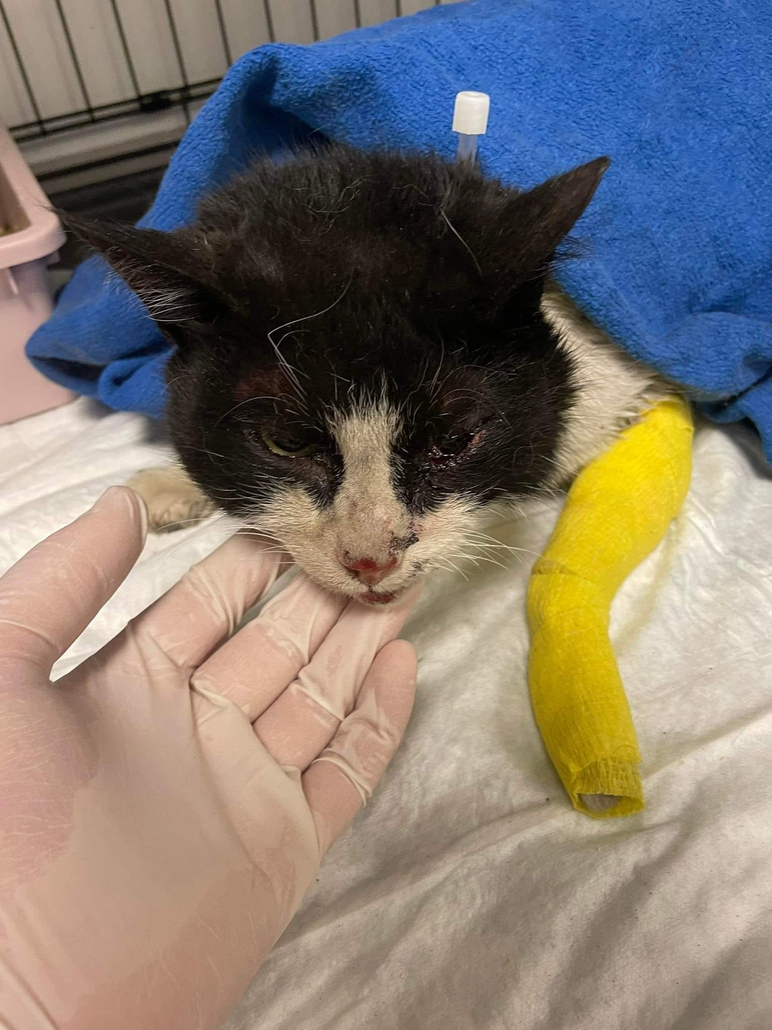 When he was first discovered, it was clear something was terribly wrong. He was rushed to the emergency veterinarian, where the truth of his condition came to light. His jaw was badly injured, one of his eyes was battling a severe infection, and his frail frame showed the toll of weeks — perhaps months — of being unable to eat properly. He was painfully underweight, crawling with fleas and mites, and his heart rate was alarmingly low. The vet believed he had likely been struck by a vehicle, leaving him in a state of extreme distress.