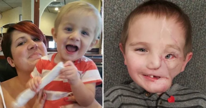 Ryder Wells, from Granite Falls, North Carolina, was only 21 months old when two large dogs attacked him at a family friend’s home. The incident left him with devastating injuries, including the loss of his right cheek, most of his lip, and part of his eyelid. He also suffered broken teeth, a fractured arm, and damage to his lung.