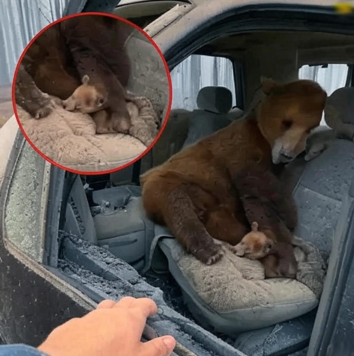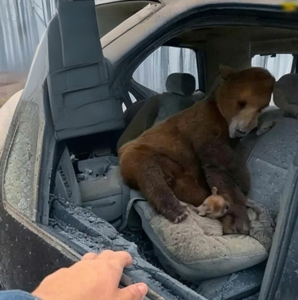 Inside a parked vehicle sat a mother bear. Her thick fur was streaked with soot, her eyes reflecting exhaustion and fear. At her feet lay her cub, still and silent, its small frame dusted with ash. The officer quickly realized that this was not an act of aggression or escape, but a moment of mourning. The mother had carried her cub into the car, unwilling to leave it behind in the chaos of the flames.