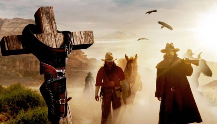 The emotional weight is carried by the rugged expressions of the returning gunslingers—each scarred by past battles yet drawn once again into a cycle of violence.
